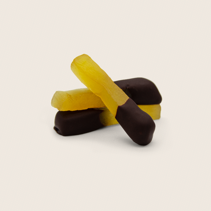Des lamelles de gingembre confites, partiellement enrobées de notre chocolat noir 75% élaboré avec les fèves Forastero d'Ayos. Le piquant du gingembre se mêle à la rondeur intense du cacao camerounais.