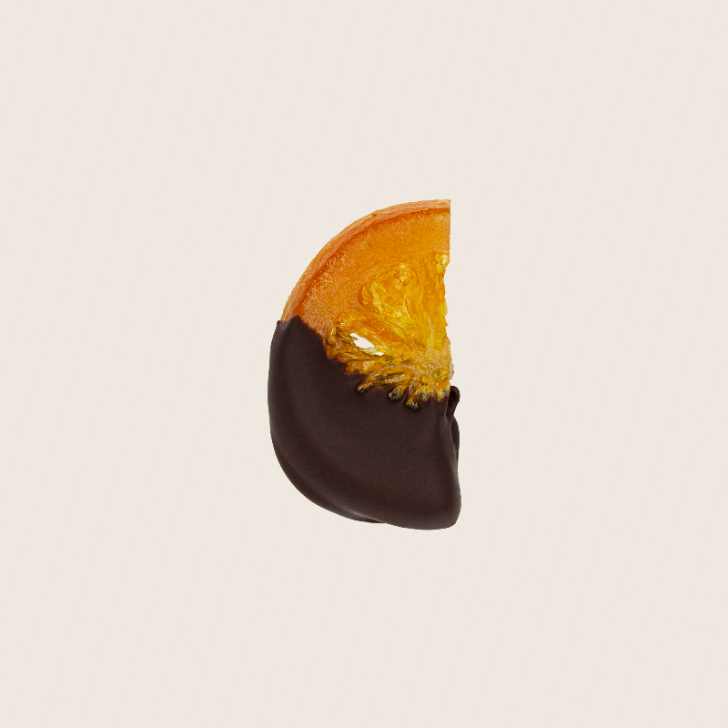 À l'atelier, chaque demi-tranche est délicatement trempée à la main dans notre chocolat noir 75%, tempéré avec précision. Ce geste artisanal préserve l'intégrité du fruit confit et crée une harmonie visuelle et gustative entre le chocolat intense d'Ayos et la vivacité confite de l'orange.